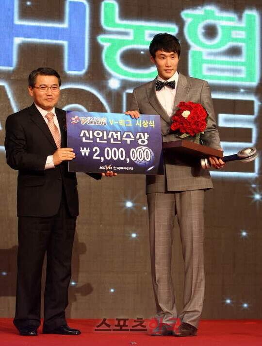 2012년 1월 9일 LIG손해보험 전에서(후위 6개, 서브 3개, 블로킹 3개) 시즌 두 번째 트리플 크라운을 차지하며 득점 전체 8위(490점)와 공격 성공률 9위(49.18%)에 올라 신인왕에 올랐습니다.